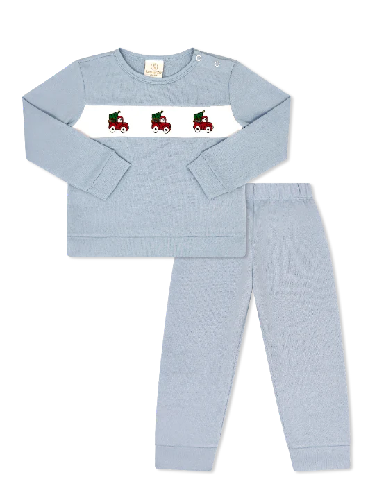 Sweet and playful, the Bayou Play Set is crafted in soft Boardwalk Blue Knit and features charming Truck with Trees embroidery for a festive touch. This cozy set includes long-sleeve top and coordinating pants, perfect for holiday play, family gatherings, or everyday comfort.