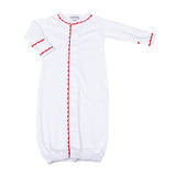 Embrace pure sweetness and adaptable convenience with this delightful converter gown, a true classic renowned for its delicate details and personalization options. Made from luxurious Pima Cotton, this white gown is accented with charming Red handmade crochet trim along the neckline, front placket, and sleeve cuffs. Its ingenious design allows it to transform from a gown to a footie effortlessly. This timeless crochet collection invites you to add a unique monogram or embroidery, transforming it into a cherished heirloom.